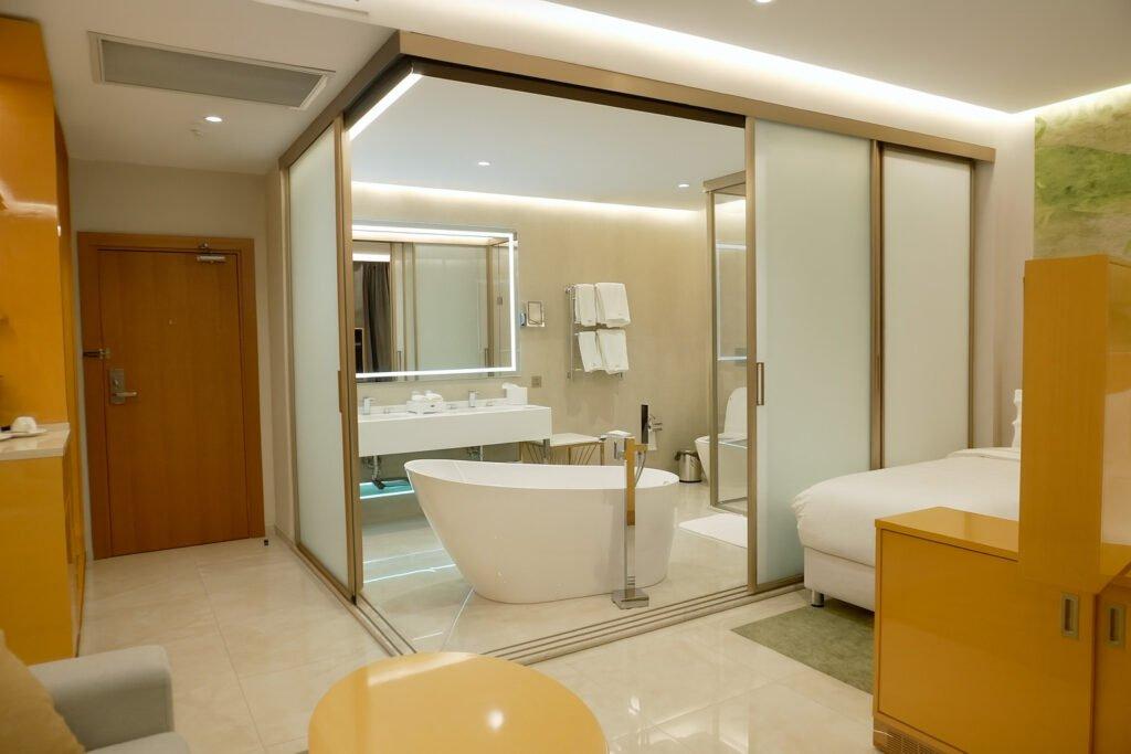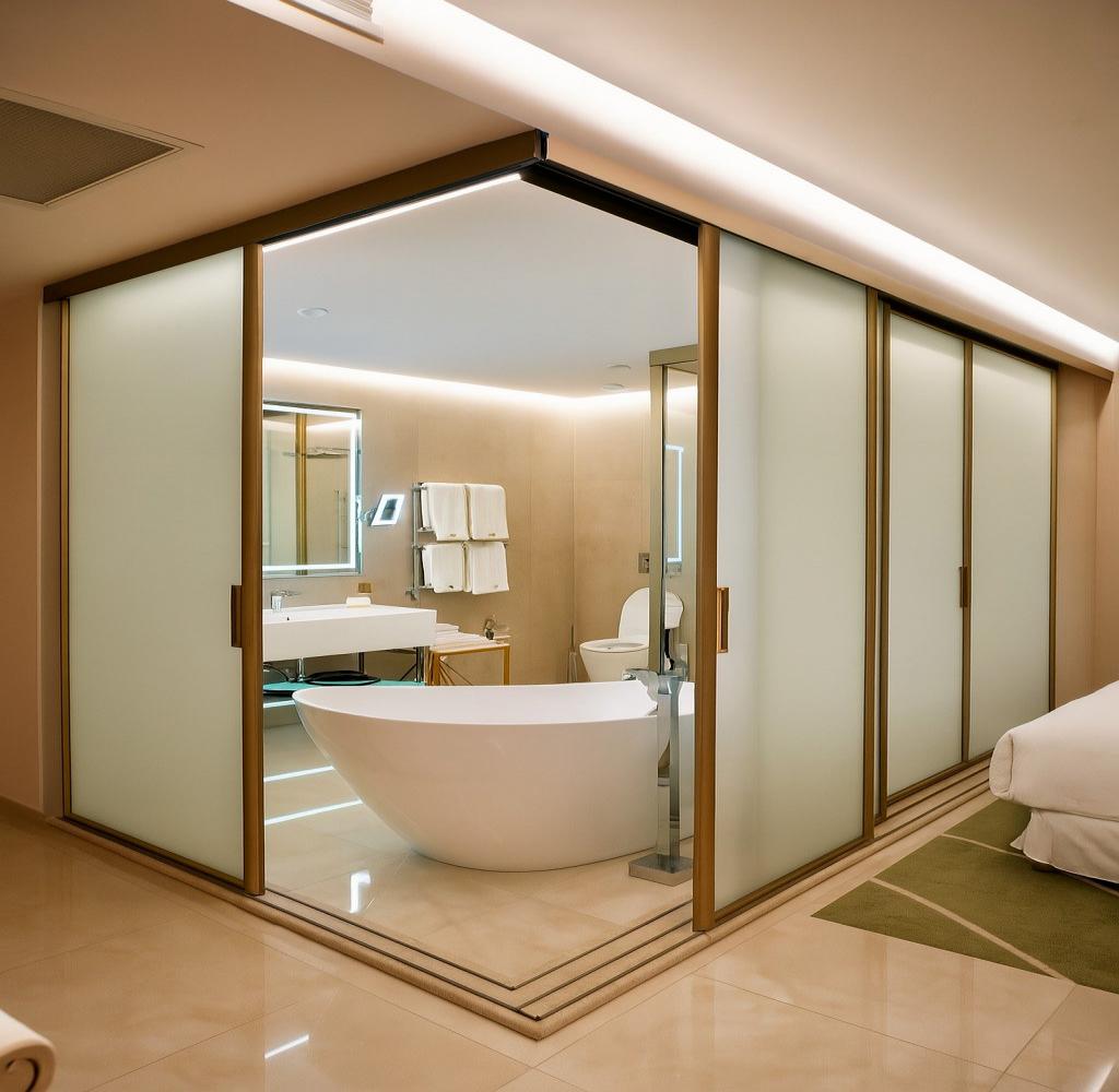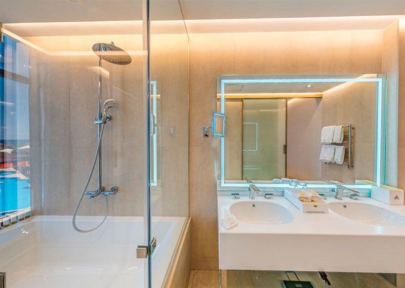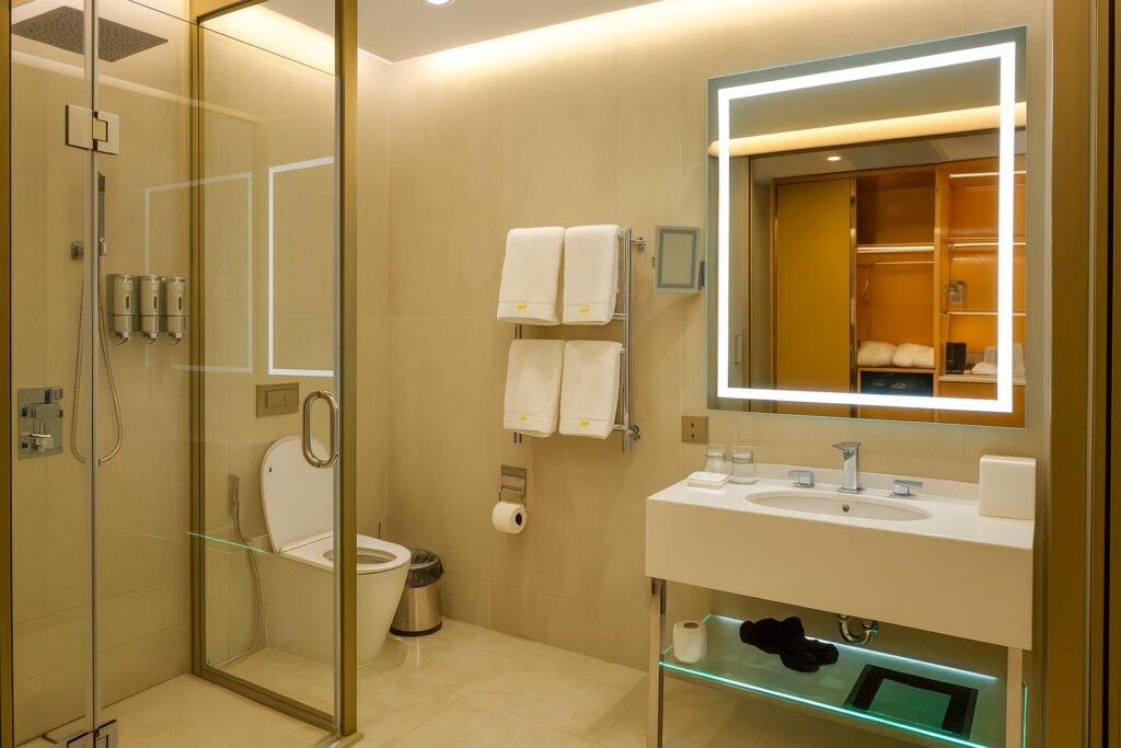 Современная ванная комната с премиальной косметикой, мягкими полотенцами и фирменными халатами.
