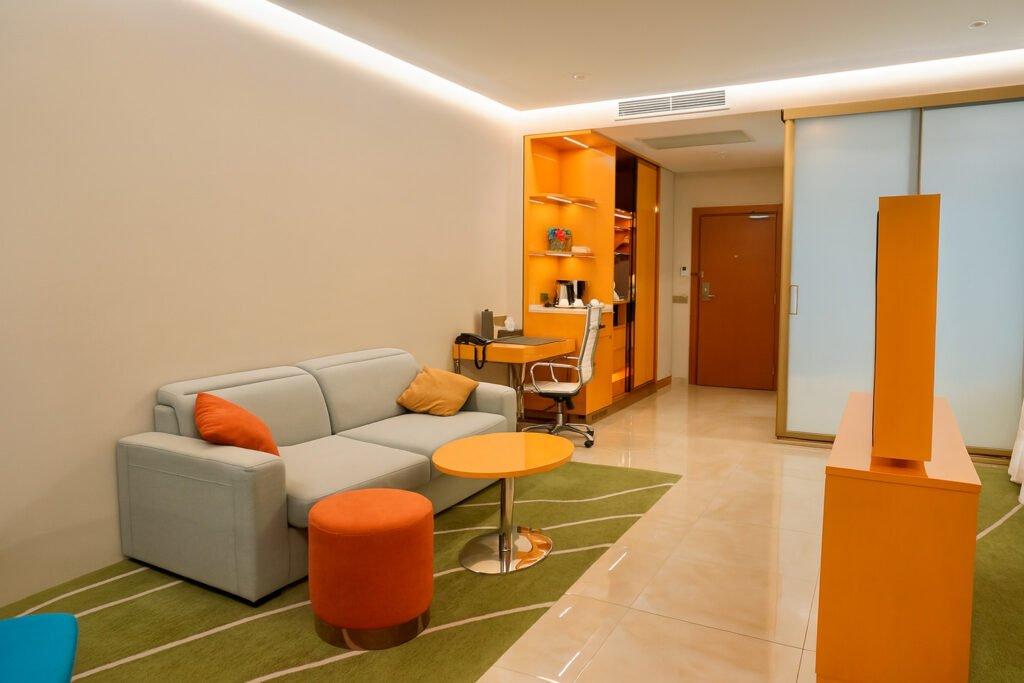 Отдельная зона для отдыха с раскладывающимся диваном и рабочая зона создают идеальные условия для комфортного пребывания. В вашем распоряжении фен, полотенца и халаты на двоих, а также сейф для вашего удобств