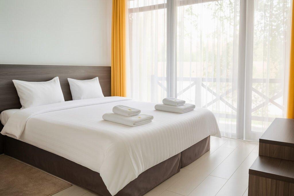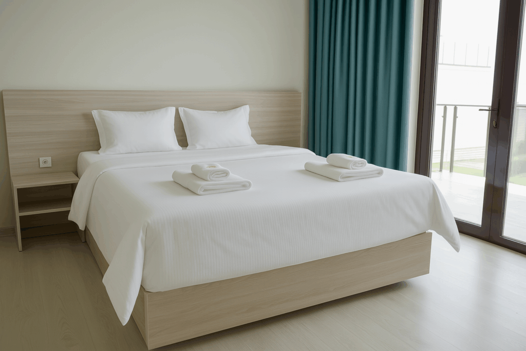 Queen-size кровать (по запросу — twin setup) с постельным бельём из премиального хлопка.