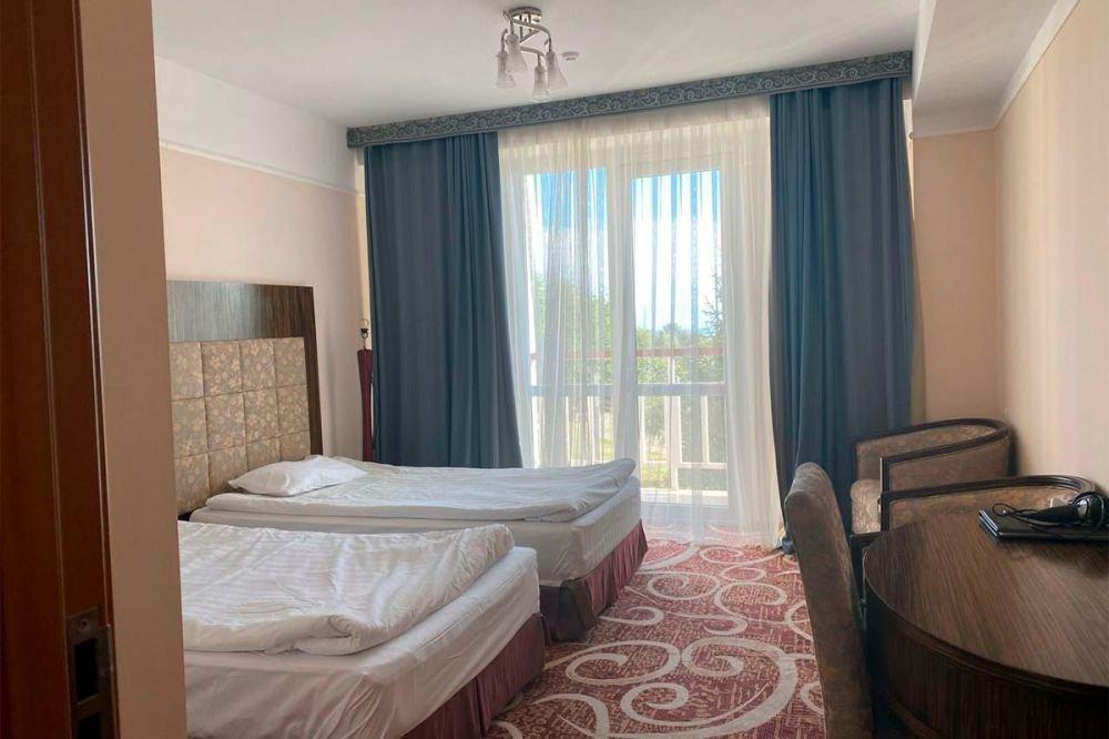 Просыпайтесь с величественными пиками Тянь-Шаня и зеркальной гладью Иссык-Куля за окном. Просторный номер европейского стандарта предлагается в двух конфигурациях:
