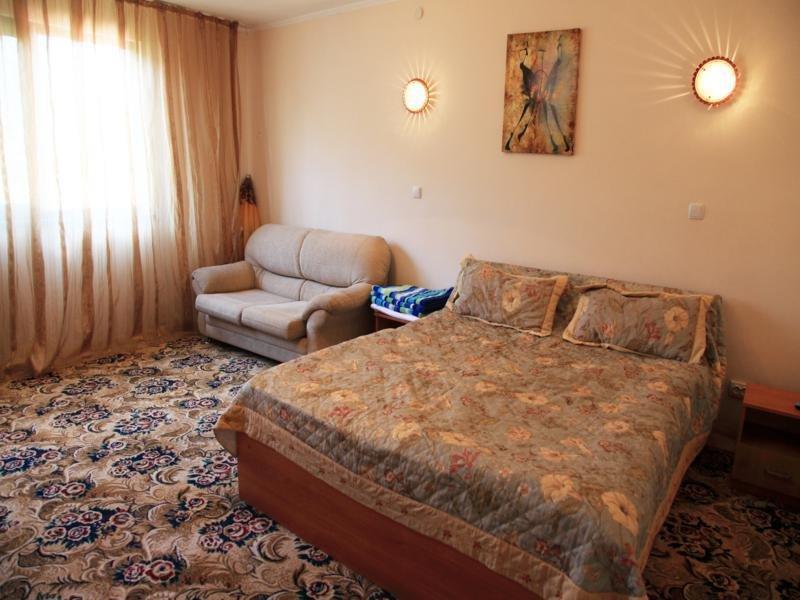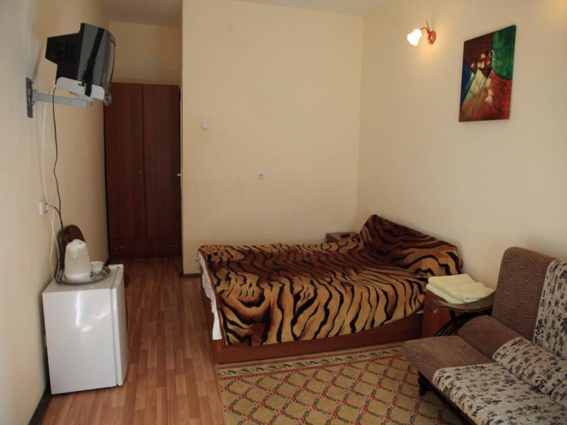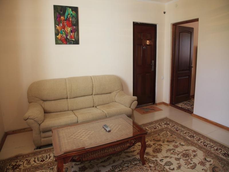 2-х комнатный. В номере: 2-х спальная кровать, раскладной диван, сан узел, душ, спутниковое ТВ, холод-к.