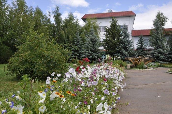 Туристический комплекс расположен в парковой зоне, буквально утопает в зелени: ели, березки, ивы склоняются над узкими пешеходными дорожками в плитке, вдоль аллей высажены цветы, бьет фонтанчик, расставлены скамейки с козырьками от солнца.