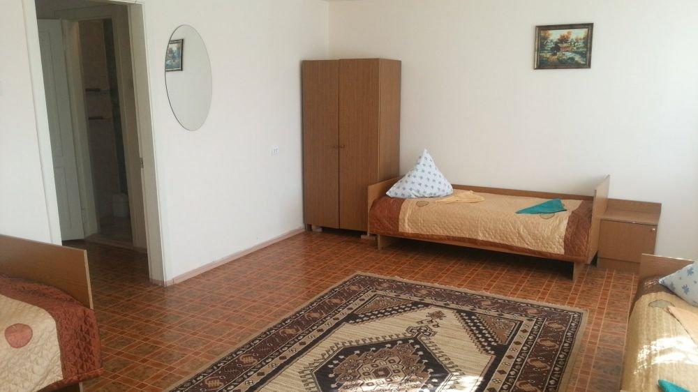 Две комнаты, коридор, 5-ть кроватей односпалок, две в одной комнате, три в другой, прикроватные тумбочки, все номера с балконом, выход на балкон с обеих коинат, туалет и ванная с умывальником отдельно, горячая и холодная вода круглосуточно, вешалка, ТВ, холодильник, стол, табуретки, коврик, стены побелены, занавеска, балкон выходит на озеро (юг).