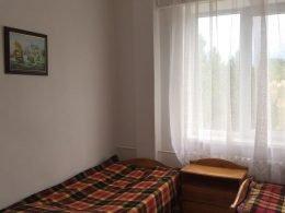 Две комнаты, 3-и кровати односпалки, две в одной комнате, одна в другой, прикроватные тумбочки, все номера с балконом, выход на балкон с обеих комнат, туалет и ванная с умывальником отдельно, горячая и холодная вода круглосуточно, вешалка, ТВ, холодильник, стол, стулья, шкаф, ковер, стены под яйцо, занавеска, балкон выходит и на горы (север) и на озеро (юг) - есть место для дополнительной кровати.