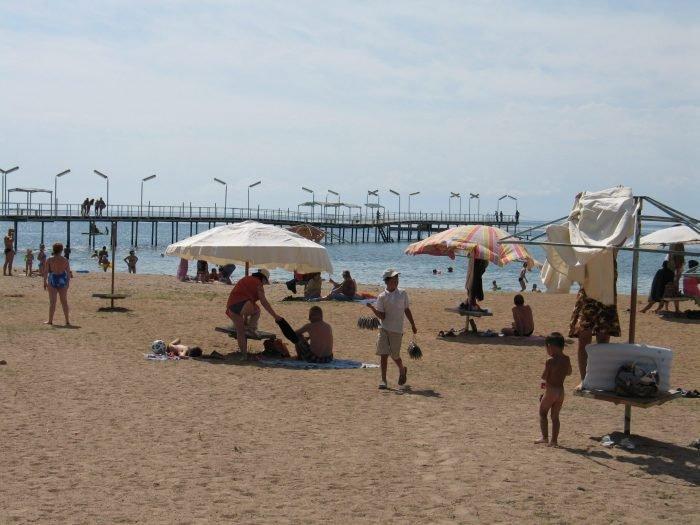 Дом отдыха находится на первой линии, у берега, и обладает собственным пляжем с самым длинным на побережье пирсом. На пирсе оборудованы специальные лесенки для комфортного погружения в воду. Вход в озеро у берега пологий, но вдоль кромки воды песок смешан с галькой. Отдыхающие на пляже могут расположиться в тени под зонтиками.