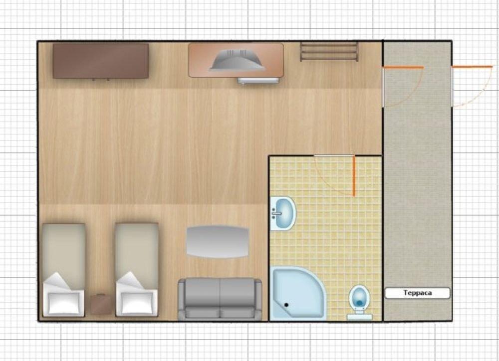 Размер номеров с террасой (1 этаж): Спальня: 23,46 кв.м., Сан. узел: 3,3 кв.м, Терраса: 7,5 кв.м.