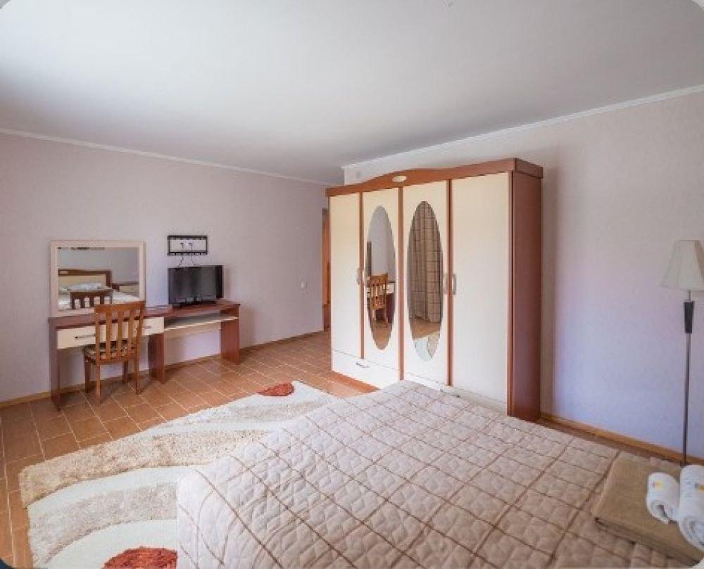 На втором этаже расположена одна спальная комната с двуспальной кроватью или двумя односпальными кроватями. В комнате есть мягкая мебель и телевизор. На первом этаже сан.узел с ванной и гостиная комната с двумя односпальными кроватями, столовым уголком и телевизором.