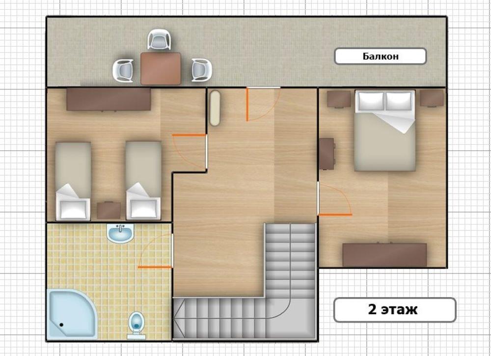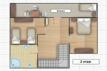 На первом этаже расположены гостиная комната, кухня, сан.узел с душем. На втором этаже три спальные комнаты и сан.узел с душем. В одной спальной комнате двуспальная кровать, во второй – две односпальные кровати и в третьей - одна односпальная кровать.