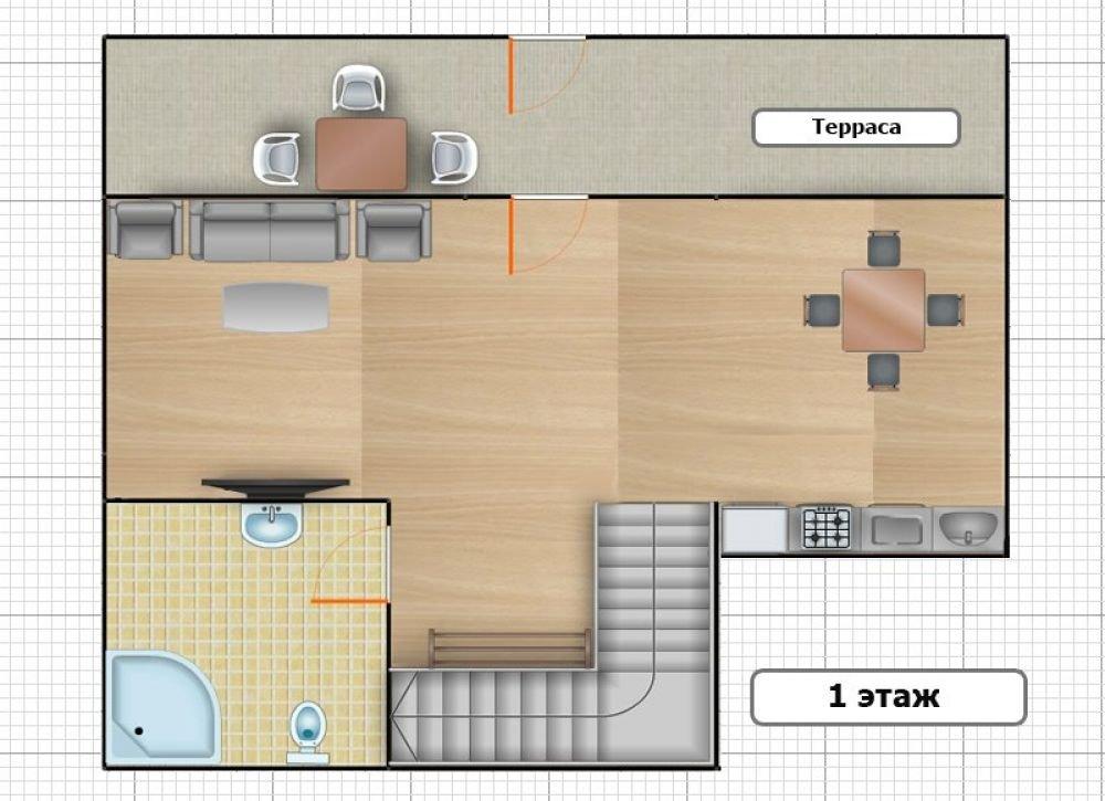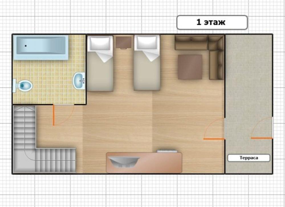 На первом этаже расположены гостиная комната, кухня, сан.узел с душем. На втором этаже две спальные комнаты и сан.узел с душем. В одной спальной комнате двуспальная кровать, во второй – две односпальные кровати.