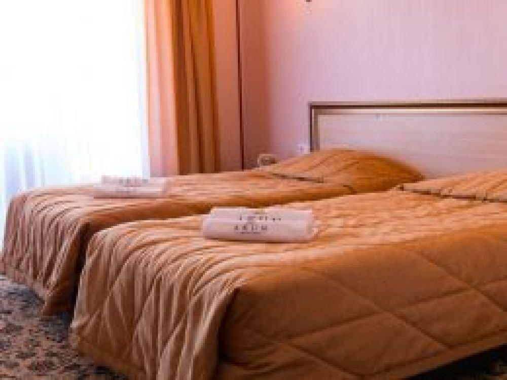 Однокомнатный узкий номер с двумя односпальными кроватями. Номер без балкона, окна выходят на сад.