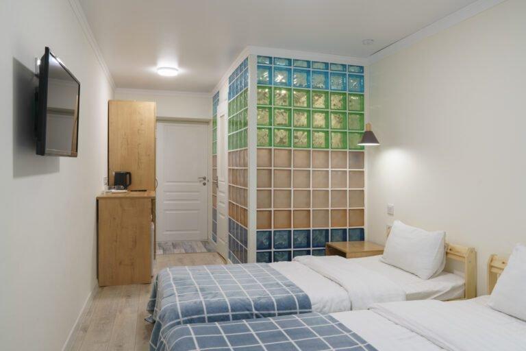 Услуги и удобства: душ/санузел, шкаф, чайник, холодильник, телевизор, балкон, вешалка для одежды, тумбочки.